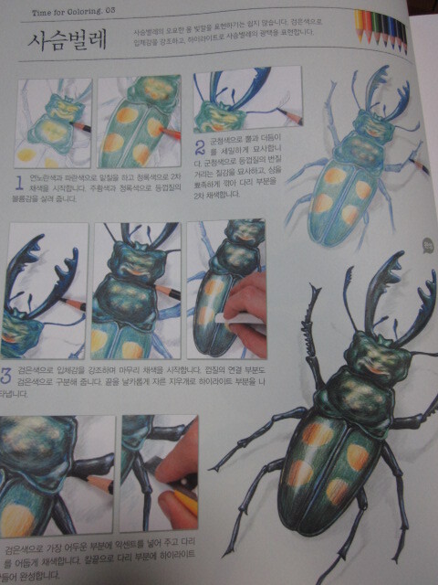 사슴벌레도 정말 진짜처럼 잘 채색되어 있는데 단계적으로 채색하는 방법이 자세하게 나와있답니다.