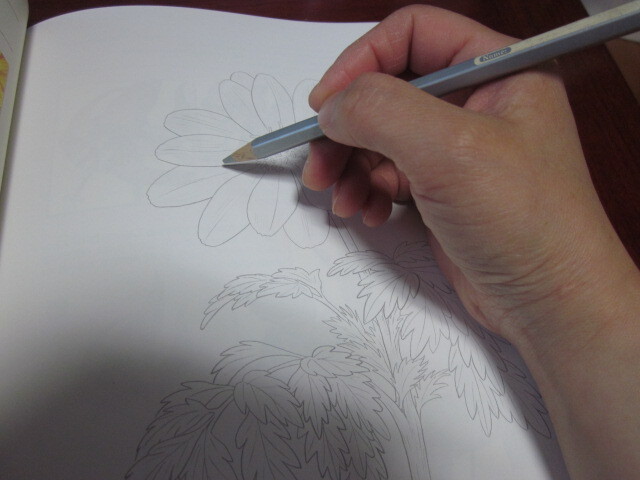 그래서 노랑이나 초록이 아닌 회색 색연필을 들고 먼저 밑색을 칠했답니다.