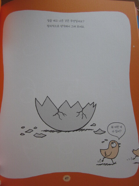 빈 알껍질로 무엇을 할까 그림을 그리는 코너도 있어요. 초등학교 1학년에 들어가면 간혹 어떤 선생님은 아침 자습시간을 이용해서 창의력노트에 이런 문제를 내주신 경우가 있답니다.