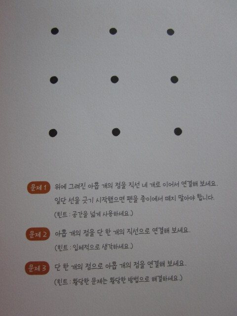 연필을 떼지 말고 선을 모두 통과하도록 네 개의 직선을 그어보라고 하네요.