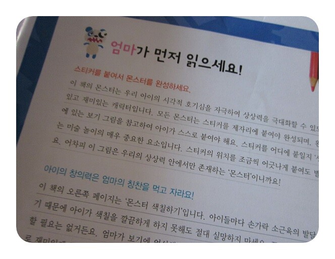 책의 머릿말에 엄마를 위한 가이드부터 나와있답니다. 스티커를 붙이고 칭찬도 많이해주라고 하네요, 그리고 아이들이 색칠을 할 때도 너무 많은