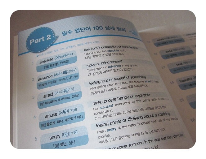 파트2에서는 필수100단어에 대해서 영영사전 처럼 영어뜻과 영어예문이 함께 소개되니 이