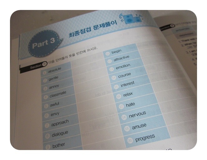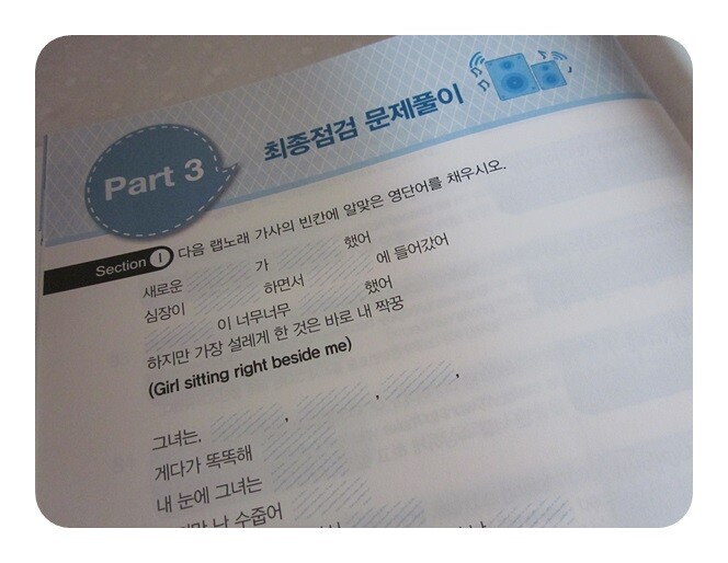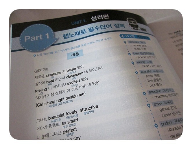 파트1에서는 노랫말이 되는 가사가 나오고 옆엔 단어가 소개된답니다.
