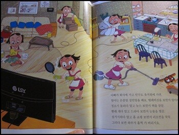 회사에서 돌아오면 녹초가 된 아빠와 엄마는 밥 한끼 후다닥 해치우고는 모두 텔레비전 앞으로 출동하게 된다. 모두 정신을 놓고 그냥 텔레비전에 몸을 맡긴 듯한 저 태도~~우리집은 아니에요.라고 말 못하면서 책장을 넘기는 엄마 아빠가 적지 않을 것 같다.