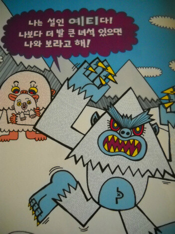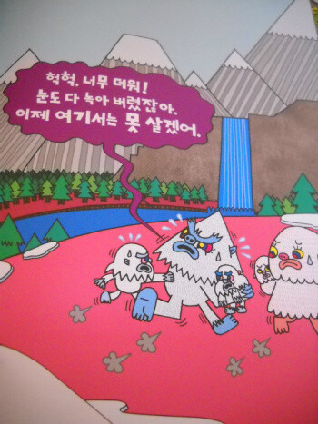 내게 가장 익숙한 괴물은 바로 가장 처음에 등장하는 설인 예티였다. 어려서 영화에서 보았던 예티가 30년이 훌쩍 넘어 아이들의 그림책에서 만나니 기분이 참 묘하고 신기했다. 한여름에도 눈이 녹지 않는 히말라야 산맥에 산다는 털복숭이 설인 예티의 가족을 보고 있자니 무서움이 순식간에 사라진다. 진짜 예티가 있다면 만나보고 싶을 정도로 말이다. 그런에 이런 예티 가족이 지구 온난화로 눈이 사라지자 설 곳을 잃고 고향을 떠나고 마네~~
