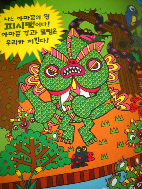 아마존의 밀림에는 피시맨이라는 괴물이 있다고 한다. 피시맨은 지구의 허파인 아마존에서 대왕 문고리 피라루쿠, 왕뱀 아나콘다 등과 친구라고 하는데 그림 속에서 그 친구들을 하나하나 찾아보는 재미도 있다.