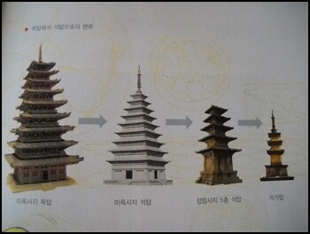 책에서 관심있게 보았던 또 한가지는 탑의 변천사이다. 중국은 흙이 많아 전탑이 많고 일본은 나무가 많아 목탑이 그리고 우리는 돌이 많아 석탑이 주를 이룬다고 한다. 목탑에서 석탑으로 옮겨가는 단계를 보여준 다음 자료가 도움이 된다.