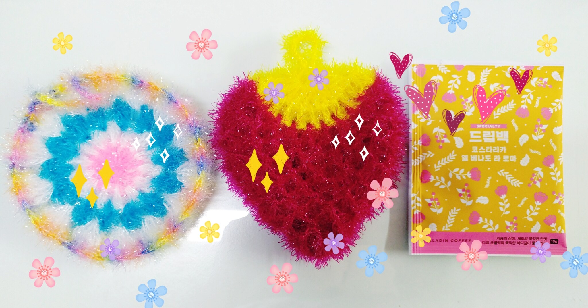 지난 12월 12일에 찍은 사진. 우리 엄마가 만든 손뜨개 수세미를 선물로 보내면서 사진 찍어둔 거예요. 실제 크기보다 포장지 안에 들어가서 조금 작게 보이는데, 알라딘 드립백보다 살짝 큽니다. 형광오렌지는 조금 밝게 보정하면 꼭 살구색처럼 연한 오렌지색이 되네요.^^ 딸기랑 동그라미 모양입니다.