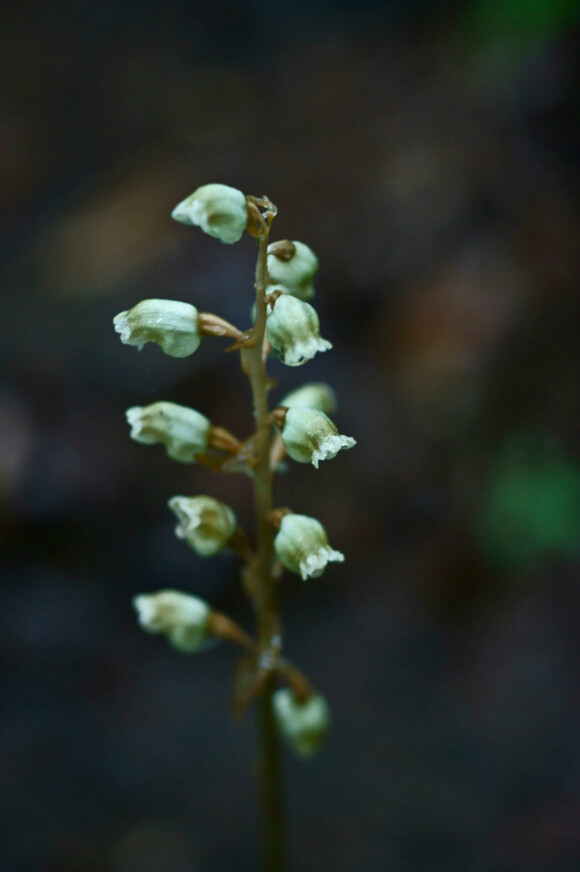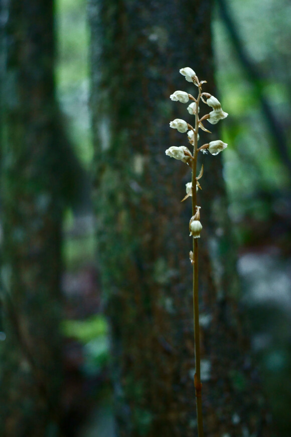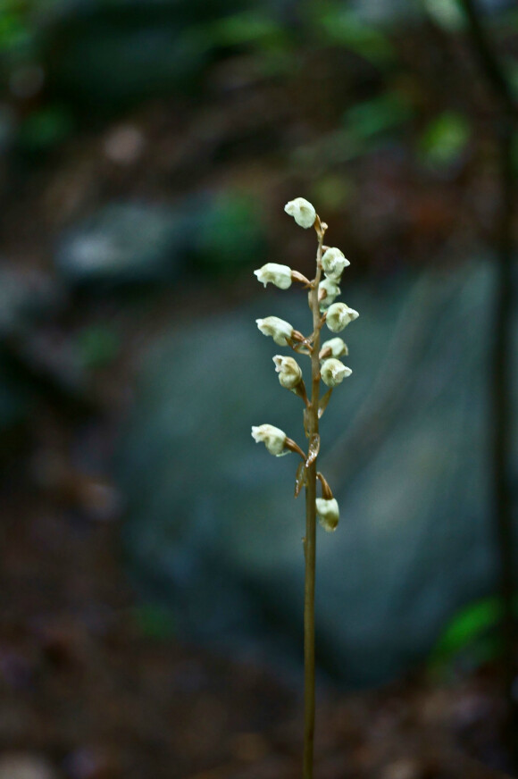 잎이 없으며, 층층이 달린 꽃이 황갈색으로 핀다. 습기 많은 여름철에 깊은 산 속에서 피어 좀처럼 눈에 띄지 않는 난초과 식물이다.