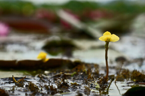통발이라는 수생식물이다. 뿌리도 없고 물 위에 뜨는 줄기를 따라 자잘한 꽃을 피운다. 노랑색이 꽃이 물 위에서 확연하게 보인다. 물고기 잡는 통발과 같은 속성에 주목한 이름이 아닌가 싶다.
