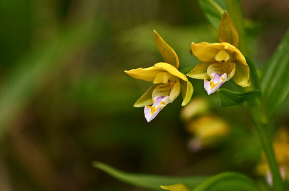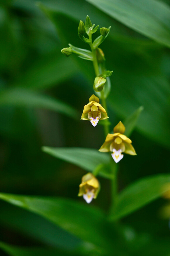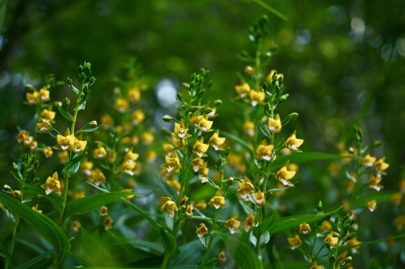주름진 녹색의 잎 사이에 황금빛색으로 유독 빛나는 꽃을 달고 아래로부터 차례로 피운다. 백색의 입술모양 꽃부리의 안쪽에는 홍자색의 반점이 유독 눈을 사로잡는다. 녹색과 노랑 그리고 하얀색의 조합이 매력적이다.