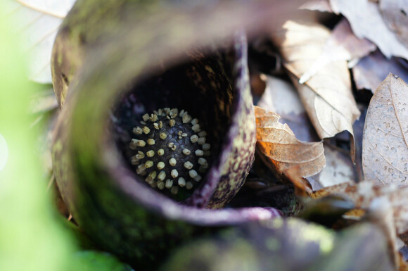 제법 큰 몸통이지만 키를 키우지는 않는다. 땅과 가까이에서 품을 넓히고 그 안에 꽃을 피운다. 꽃은 붉은 얼룩이 있는 주머니처럼 생긴 포 안에 담겼다. 꽃이 지면서 부채처럼 넓은 잎이 나온다. 앉은부채는 꽃을 피울 때 스스로 열을 내고 온도를 조절하는 신비한 식물로 알려져 있다.