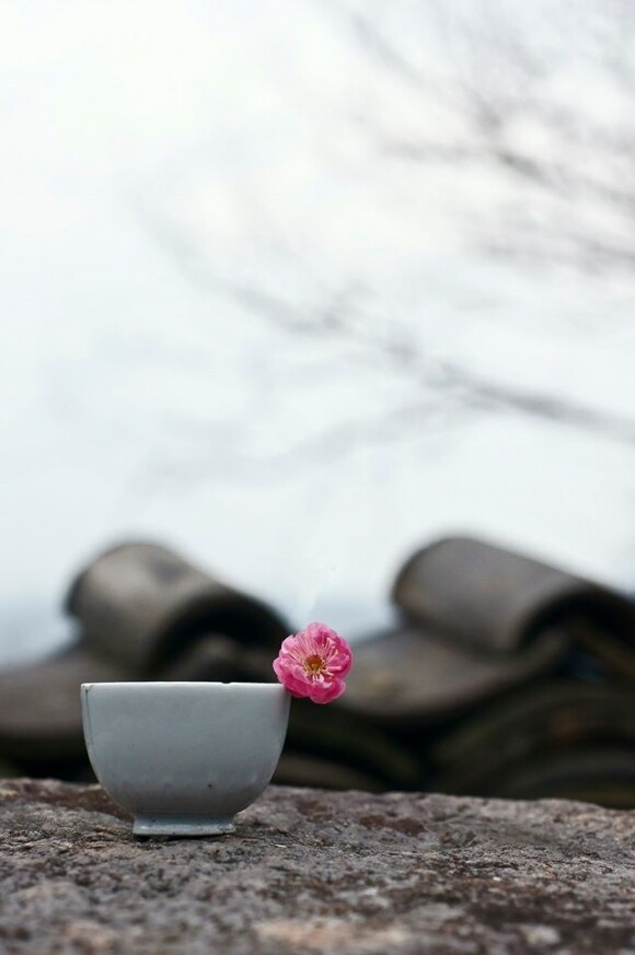 대웅전 앞 마당 담장 가까이에서 걸음을 멈추고 눈에 익은 풍경과 마주 한다. 지난해 보았던 그 모습 그대로 놓은 찻잔에 홍매 한송이 피었다.
