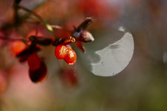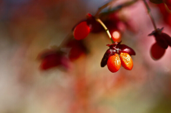 이 붉디붉은 속내가 어디에 숨었다가 드러나는 것일까. 여리디여린 잎과 연초록의 꽃으로는 짐작되지 않은 색감이다. 붉게 물든 잎이 떨어지며 남긴 아쉬움까지 덤으로 담아 열매는 더 붉어지는 것일까. 어쩌면 스스로를 보호하고자 코르크로 한껏 부풀린 가지와는 상반된 이미지다. 쉽게 보여야 열매의 몫을 다할 수 있다는 것이리라.