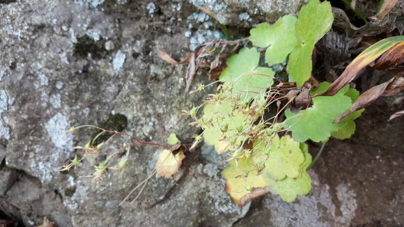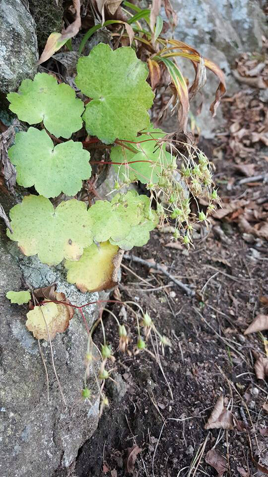 톱니 모양의 결각을 가진 둥그런 잎이 나고 길게 자란 꽃대에서 흰색의 꽃을 피우며 바위에 붙어 자란다. 꽃모양은 도심의 화단에서도 쉽게 볼 수 있는 바위취를 닮았다.