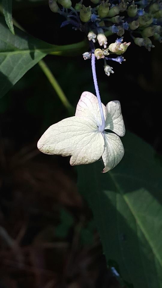 산수국의 헛꽃이 뒤집어 졌다. 참꽃보다 크고 화려한 모습으로 매개체를 유혹하는 사명을 다하고 뒤집어져 이렇게 임무완수의 표시를 한다. 매개체의 헛수고를 덜어주려는 배려가 담겼다. 식물의 헛꽃은 그 주어진 사명을 완수하고 깔끔한 모습으로 끝마무리 까지하고서 생을 마감한다. 그렇더라도 헛꽃이라는 것은 어쩔 수 없다.