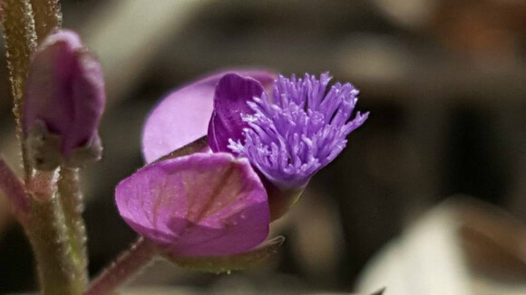 나비가 날개를 펼치고 날아가는 모습을 닮았다. 마주나는 잎 사이에 숨어 보라색의 신비로움을 활짝 펴고 있다. 풀들이 본격적으로 땅을 점령하기 전에 작은키를 키워 꽃을 피운다. 숨어피지만 제법 눈에 띄는 이유도 색의 대비에서 오는 것으로 보인다.