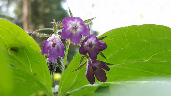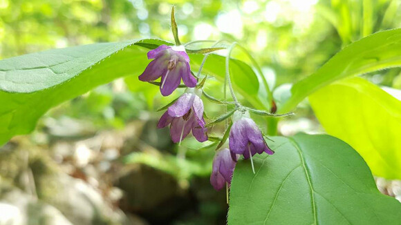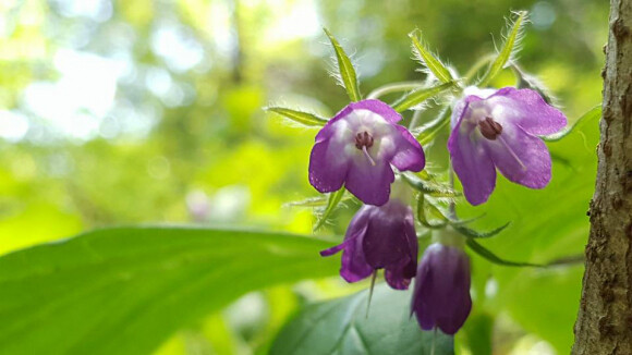 제법 긴 잎이 난 자리에 종모양의 자잘한 몇송이 꽃이 모여 피었다. 진한 보라색의 꽃이 초록색 잎과 대비되어 금방 눈에 띈다. 가느다란 꽃대에 고개를 숙이고 있어서 온전한 모양새를 보기가 쉽지 않다.