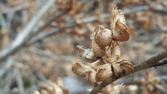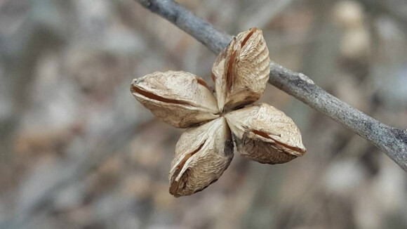 독특한 모양의 열매가 그냥 지나치지 못하게 발걸음을 붙잡는다. 4개의 씨방이 대칭형을 이루며 꽃처럼 달려 있다.