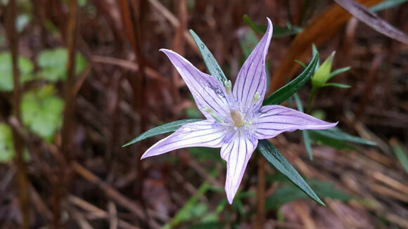 꽃은 9~10월에 위쪽 잎겨드랑이에서 모여 달리며, 위에서부터 피고, 연한 붉은빛이 도는 보라색이다. 짙은 색의 잎맥이 있고 밑부분에는 가는 털들이 많이 나 있다.