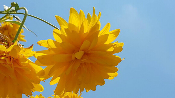 꽃은 7~8월에 줄기와 가지 끝에 1-3개씩 달리고 황록색이며, 겹꽃이다.