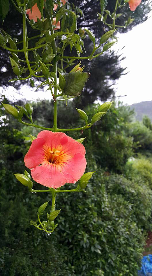 '능소화'는 중국 원산으로 우리나라 전역에서 심어 기르는 덩굴나무이다. 꽃은 7~8월에 피며 새로 난 가지 끝에 달리고 노란빛이 도는 붉은색이다.