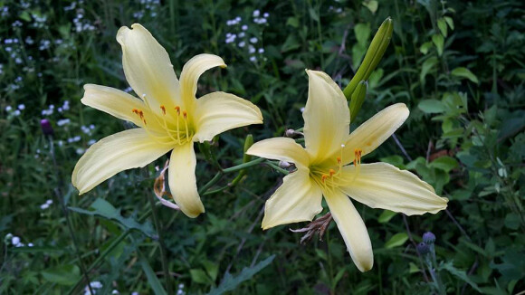 꽃은 7~8월에 잎 사이에서 나온 긴 꽃줄기 끝에서 가지가 갈라져 백합 비슷하게 생긴 여러개의 등황색 꽃이 모여 핀다. 아침에 피었다가 저녁에 시드는데, 계속 다른 꽃이 달린다.