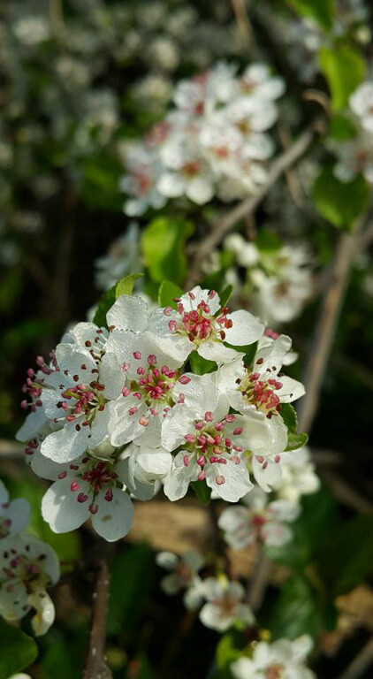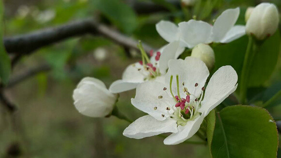 꽃은 4∼5월에 흰색으로 피고 짧은 가지 끝에 5∼9개씩 달린다. 꽃잎은 5개이고 둥글거나 달걀을 거꾸로 세운 모양 또는 넓은 달걀 모양이다.