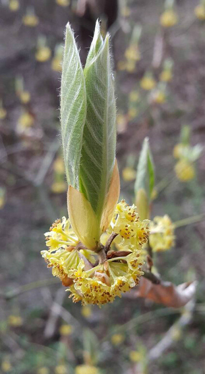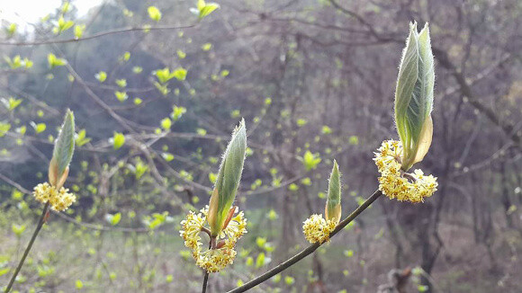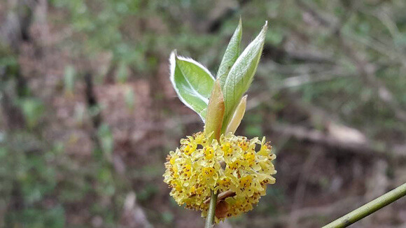 꽃은 암수딴그루로서 4월에 노란색으로 피고 잎겨드랑이에 달린다. 생강나무꽃과 유사하여 혼동하기쉽다.