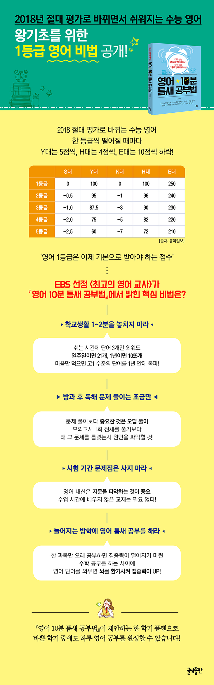 2018년 수능에는 큰 변화가 있다. 영어가 절대 평가로 바뀌는 것이다. 지금의 수능 영어는 상대 평가로 한 문제만 틀려도 1등급을 받기 어렵다. 실수만 해도 등급이 갈리는 경우가 허다하다. 하지만 절대 평가를 시행하는 내년부터 모든 학생은 시험 점수를 90점만 넘게 받으면 영어 1등급을 받을 수 있다. 즉 영어 만점에 대한 부담감을 덜 수 있는 것이다.