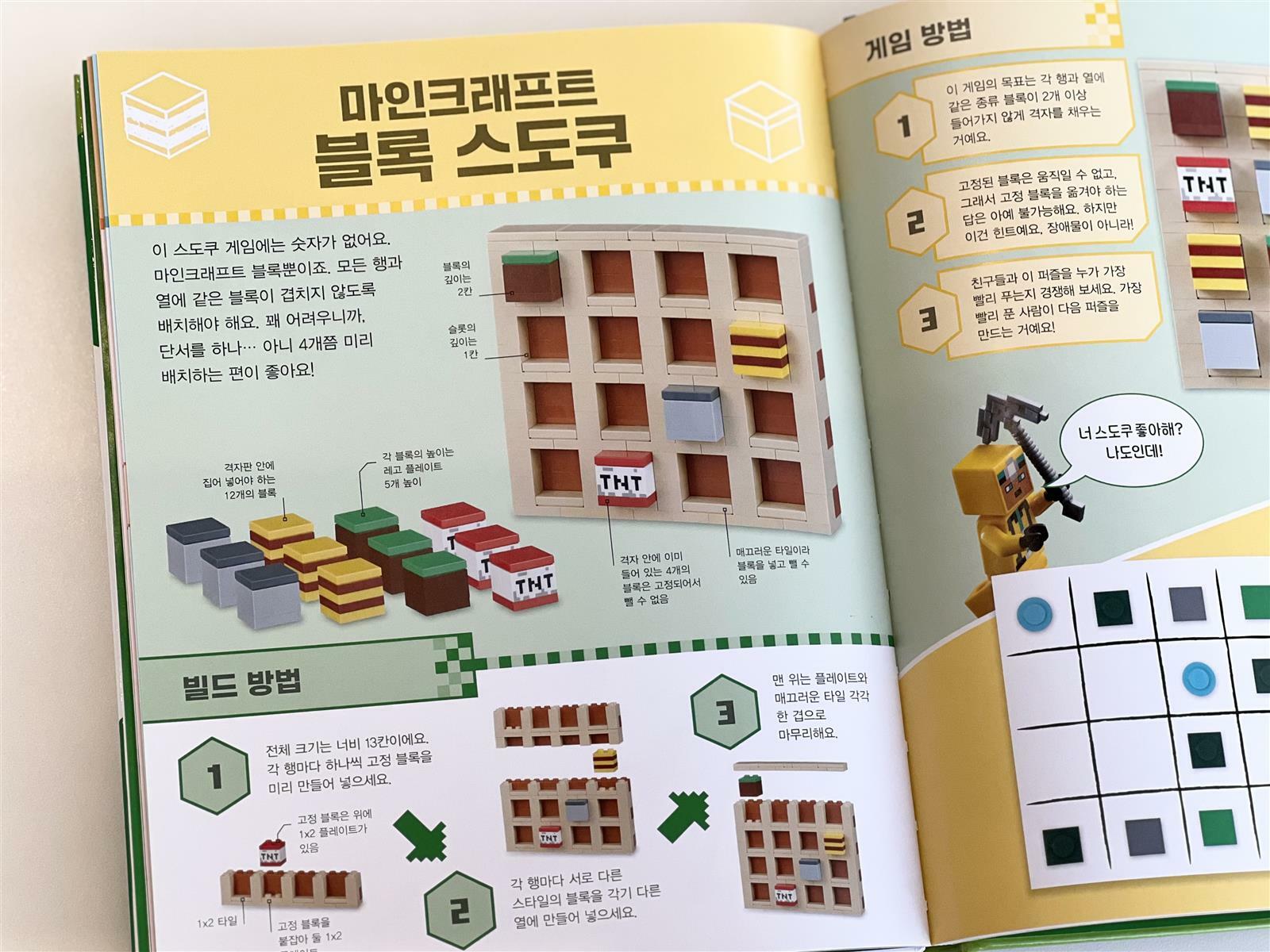 머리를 많이 써야 할 것 같은 마인크래프트 블록 스도쿠, 크리퍼를 볼링장에서 먼저 날려버릴 수 있는 크리퍼 크래시, 다양한 야생 식물 키우기 마라톤 등 재미있는 아이디어들로 가득한 책이다. 레고 마인크래프트 디자이너의 깜짝 인터뷰를 통해 빌드를 위한 최고의 팁도 배울 수 있으니 놓치지 말아야겠다.