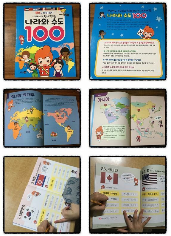 대한민국의 서울로 시작해서 북한의 평양, 일본의 도쿄, 몽골의 울란바토르, 타이완(대만)의 타이베이, 중국의 베이징(북경), 인도네시아의 자카르타, 캄보디아의 프놈펜 등등 나라와 수도뿐 아니라 국기와 나라에 대한 간략한 설명이 나와 있어서 좋아요. 각 나라와 수도를 쓸 때마다 지도로 위치를 확인하니까 세계 지도에 대한 관심과 흥미가 더 생긴 것 같아요.