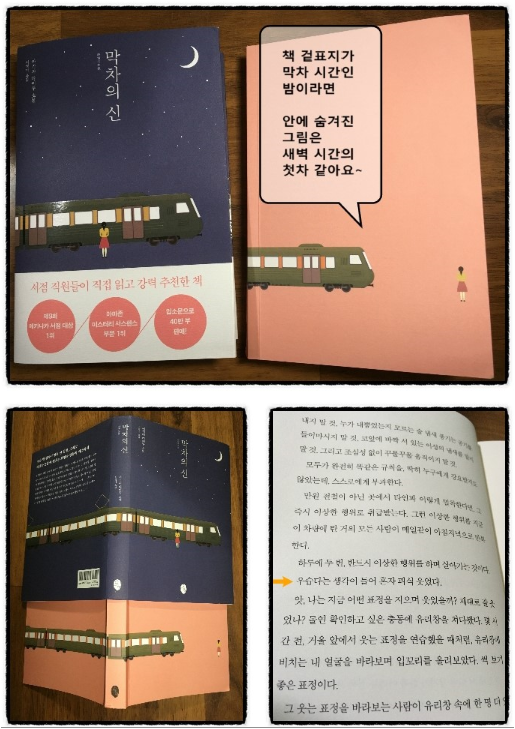 재미있는 건 책의 겉표지 그림은 막차 시간인 한밤중인데, 표지를 걷어낸 책의 그림은 환한 살구빛이라는 것입니다.