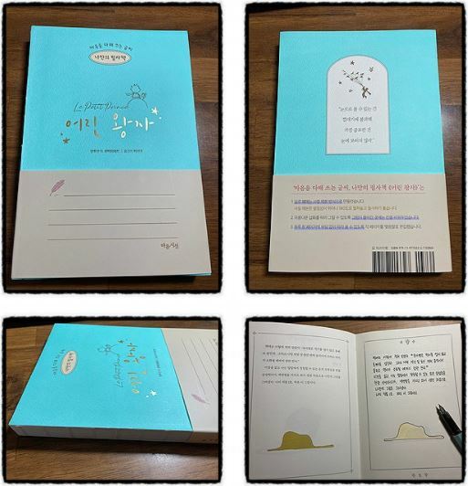 어린왕자를 사랑하는 사람이라면 이 책을 보자마자 바로 끌렸을 거예요. 읽기만 하는 책이 아니라 책 안에 자신의 손글씨로 적어볼 수 있는 빈칸이 있어서, 세상에 하나뿐인 나만의 필사책이 되는 거예요. 책 표지 디자인이 하늘빛이라서 마음에 쏙 들고, 책등이 옛날 서책처럼 실로 꿰맨 자국이 보여서 멋져요. 제본이 180도 펼쳐지는 방식이라서 글씨 쓰기가 정말 편리해요. 종이의 질도 두툼해서 글씨를 쓸 때 뒷장에 비침이 거의 없고, 부드러운 종이라서 만년필로 쓸 때 필기감이 좋네요.