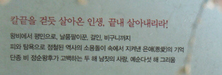 그래서 소설이라기 보다는 어떤 역사적 사실들의 열거와 같은 느낌도 든다. 그렇지만 조선에서 그 당시에 일어났던 사건들에 끼워진 정순왕후의 애닯은 속삭임이 혼백의 속삭임이기에 읽는내내 애처롭게 느껴진다.