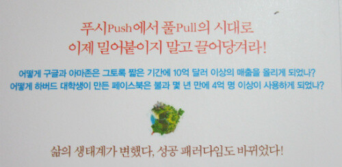 이 책은 pull 의 시대에 대해서  잘 알지 못하는 독자들에게 차근차근 설명식으로 알려주기는 하지만, 다소 생소한 내용들이라는 생각이 들기도 한다. 그러나 긍극적으로는 자기 주변의 세상을 폭넓게 끌어 들이고 그 세상의 잠재력을 깊이 이해하라는 이야기라 할 수 있다.