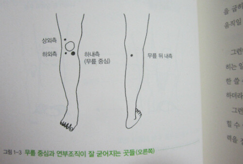 " 이 증세를 치료하는 것 역시 굳어진 것을 물리적으로 부드럽게 하는 과정(두들기기, 관절근육, 스트레칭)을 통한 것이 기본 중의 기본입니다. 그러므로, 통증을 싹 없애준다는 어떤 효과 좋은 약, 무릎이나 허리에 좋다는 소문난 어떤 보조식품이나 음식을 통해서 이런 증세를 해결하려는 것이 근본적인 것이 아닐 수 있습니다. " (p. 178)