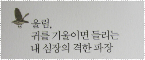 " 울림은 내 마음속에서 일어나는 움직임이다 귀를 대고 가만히 들으면 언제라도 들을 수 있는 마음이 하는 말, 내가 '원하고 꿈꾸고 되었으면'하고 바라는 내면 깊은 곳에서 터져 나오는 진심이 바로 울림이다." (p. 17)