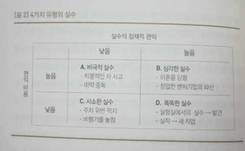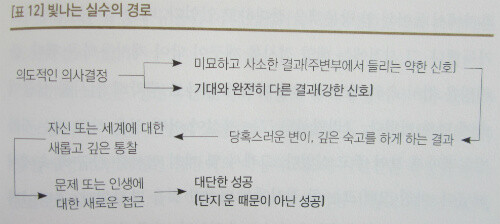 그런데 이 책에서는 실수에 대한 새로운 시각을 가지게 해 준다. 실수는 발견으로 가는 관문임을 말해 준다. '오류가 왜 유용한 것인가', '실수에도 급이 있다.', '빛나는 실수와 비극적인 실수를 구분하는 방법', '전자의 실수를 의도적으로 디자인하고 후자의 실수를 피하는 방법'등을 알려준다.
