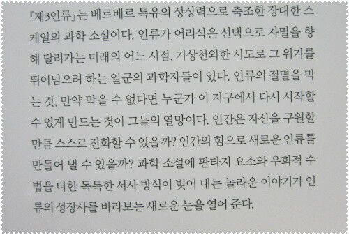 그 속에 담긴 '베르나르'의 지식이라면 앞으로도 특별한 내용을 담은 소설들이 출간되리라는 생각을 가지게 되는데, <제3인류>도 바로 그런 '베르나르'만이 쓸 수 있는 소설이라는 생각이 든다.
