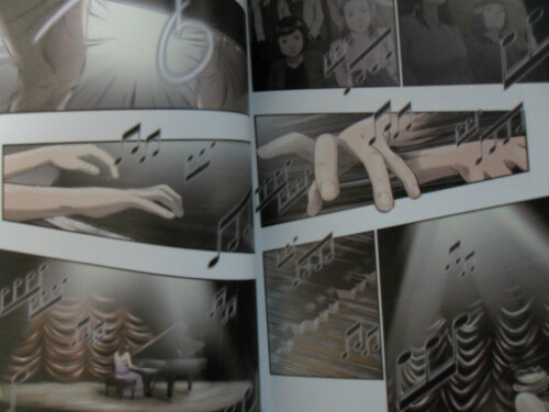 <다이아몬드 더스트>는 3권으로 되어 있는데, 책 속의 만화에서 찾을 수 있는 특징으로는 피아노 소리, 의성어는 그림 속에서 흔들리는 모습을 보여 준다.