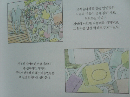 " N 서울 타워를 찾는 연인들은 서로의 마음이 굳게 잠긴 채로 영원하길 바라며 전망대 난간에 자물쇠를 채워놓고, 그 열쇠를 남산 아래로 던져 버린다. 영원히 잠겨 버린 마음이라니, 좀 섬뜩하긴 하지만 무언가를 간절히 바라는 마음만큼은 꽤 값진 것이라고 생각한다.