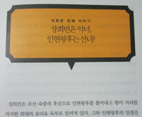 이 책 속의 내용은 서양의 이야기, 동양의 이야기, 우리나라의 이야기가 시대를 불문하고 고루 담겨져 있다. 그중에 우리 역사 속의 이야기중의 하나는 TV 역사극의 단골 메뉴인 <인현왕후와 장희빈>의 이야기이다.