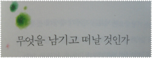 책의 끝부분에서 '무엇을 남기고 떠날 것인가' 라는 질문에 어떤 답을 할까 망설여지게 된다.