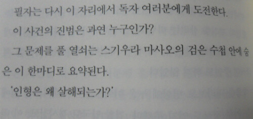 이 사건의 풀 수 있는 실마리는 인형 살해사건의 의미를 꿰뚫어 보는 것으로부터 출발하여야 사건 전체를 풀 수 있는 비밀을 찾아 낼 수 있는 것이다.