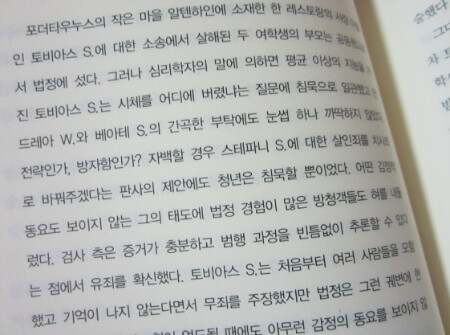 두 명의 보덴슈타인과 피아 형사를 따라서 사건의 진실을 밝혀 나가는 과정은 이 책을 읽는 독자들도 토비아스가 결코 살인자가 아닐 것이라는 생각을 하게 한다.