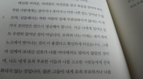 " (...) 하지만 이제는 헤어질 시간이 되었습니다. 나는 죽으러 가고, 여러분은 살러 갈 것입니다. 그러나 우리 중에서 어느쪽이 더 나은 운명을 향해 가는지 신말고는 아무도 모릅니다. " (p. 69)