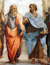 (사진출처 : Daum - 왼쪽: 플라톤 조각상, 오른쪽 : '아테네 학당'의 부분 - 플라톤과 아리스토텔레스)