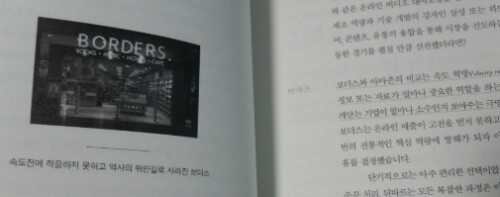 서점체인 중에는 보더스를 들 수 있는데, 이는 온라인을 포기하는 순간 소비자와의 연결을 잃게 되었고, 그것은 보더스를 무너지게 만들었다. 그런데 비하여 아마존은 고객들에게 많은 것을 제공하기 위해 분석하고 그를 활용하여 지금도 서점업계에서 굳건히 살아 남을 수 있었던 것이다.