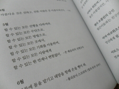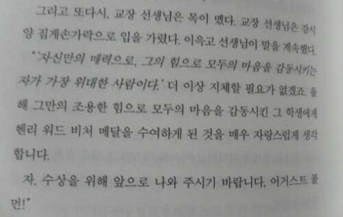 " (...) 친절이란, 참으로 간단한 일. 누군가 필요로 할 때 던져 줄 수 있는 따뜻한 격려의 말 한 마디. 우정 어린 행동. 지나치며 한 번 웃어주기." (p. 457)
